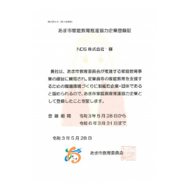 あま市 家庭教育推進協力企業登録証