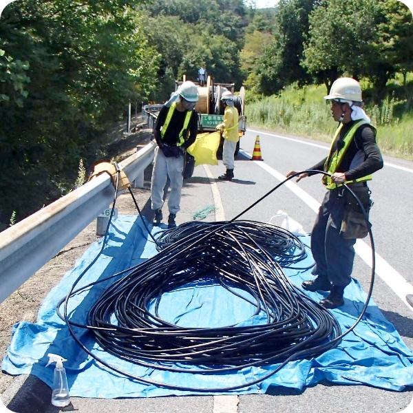 道路に光ケーブルやメタルケーブルを敷設し、通信ネットワークを構築します。通信ケーブルは各設備、機関を繋ぐ重要な役割を持っています。